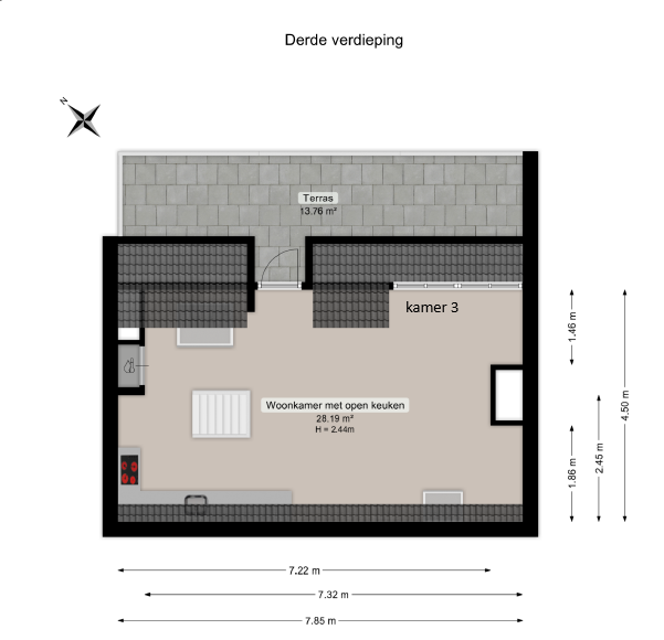 Via de hal krijg je toegang tot alle kamers en de verschillende gemeenschappelijke ruimtes. Alle kamers beschikken over een eigen keuken, voorzien van een inductiekookplaat, koelkast en oven. De badkamer en het toilet worden gedeeld. De badkamer is uitgerust met een douche en wastafel, en het toilet bevindt zich op de hal. Kamer 3 Heeft een oppervlakte van circa 28 m² en beschikt daarnaast over een eigen dakterras van circa 13 m².
