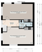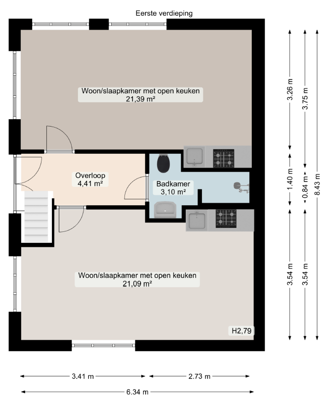 Bij binnenkomst kom je in de hal, die toegang geeft tot de kamer en de gedeelde badkamer. De badkamer is voorzien van een douche, wastafel en toilet en wordt gedeeld met één mannelijke huisgenoot. De kamer heeft een oppervlakte van circa 21 m² en beschikt over een eigen keuken met koelkast, gasfornuis en afzuigkap.