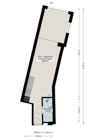 De studio bevindt zich op de begane grond. Je komt binnen in de woon-slaapkamer met open keuken. Bij binnenkomst zit direct rechts de badkamer. De keuken is voorzien van een vaatwasser, combimagnetron, afzuigkap, gaskookplaat en een koelkast. De badkamer beschikt over een douche en wastafel.