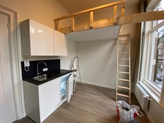 De kamer bevindt zich op de eerste verdieping van het pand en beschikt over een eigen keuken met een koelkast en inductiekookplaat. Daarnaast is de kamer voorzien van gordijnen en een PVC-vloer. De badkamers en toiletten worden gedeeld met negen andere bewoners. Tevens beschikt het pand over een gedeelde achtertuin van circa 60 m².
