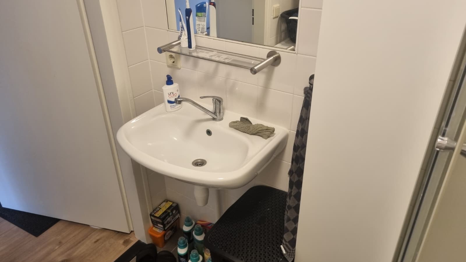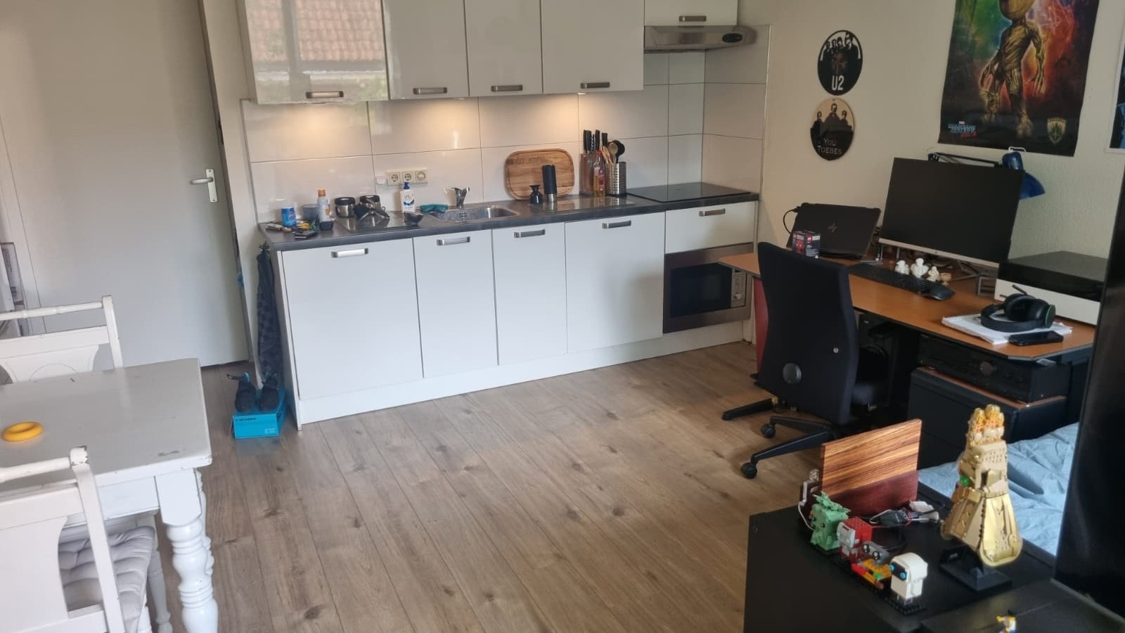 Deze studio van circa 32 m² is gelegen op de eerste verdieping en biedt een comfortabele woonruimte. De lichte woon-/slaapkamer beschikt over een open keuken, voorzien van een kookplaat, afzuigkap, koelkast en vaatwasser. De studio heeft een nette badkamer met douche, wastafel en toilet. Daarnaast kun je gebruikmaken van een gemeenschappelijke fietsenberging en een gedeeld dakterras.