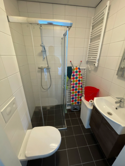 De studio bevindt zich op de eerste verdieping van het pand en heeft een oppervlakte van circa 27 m². De woon/slaapkamer beschikt over een open keuken die is voorzien van een vaatwasser, combi-oven/magnetron, inductiekookplaat, afzuigkap en koelkast. De badkamer is voorzien van een douche, toilet en wastafel.
