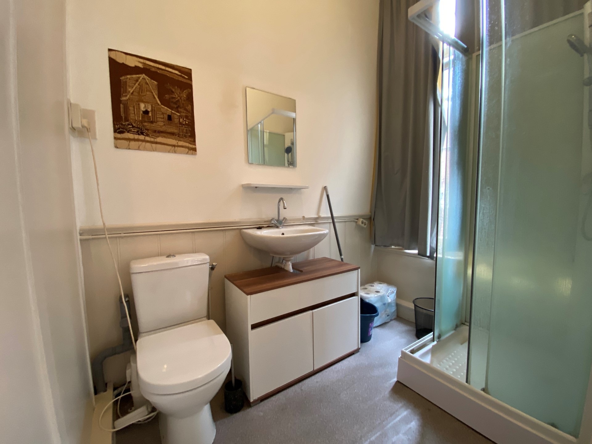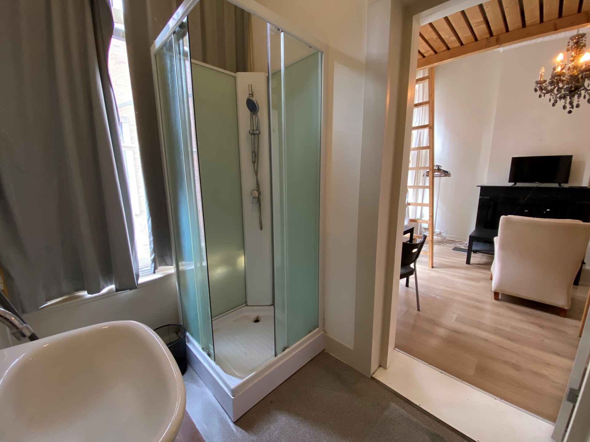 Via de gedeelde hal betreedt u de woning. De studio is gelegen op de eerste verdieping en heeft een totale woonoppervlakte van circa 24 m². De indeling bestaat uit een woon-/slaapkamer met open keuken en een badkamer. De keuken is voorzien van een eenvoudig keukenblok. De badkamer beschikt over een douche, wastafel en toilet. De studio wordt gemeubileerd verhuurd, zoals weergegeven op de foto’s