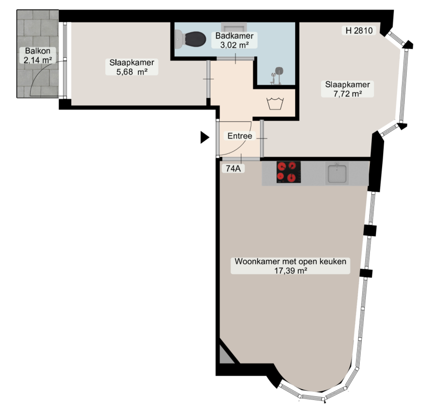 Gelegen op de tweede verdieping, beschikt dit appartement over een woonoppervlakte van circa 38 m². Er zijn twee slaapkamers en een lichte woonkamer met een open keuken. De keuken is volledig uitgerust met een inductiekookplaat, combi-oven/magnetron, vaatwasser, koelkast en afzuigkap. De moderne badkamer is voorzien van een douche, wastafel en toilet. Daarnaast is er een balkon aanwezig.