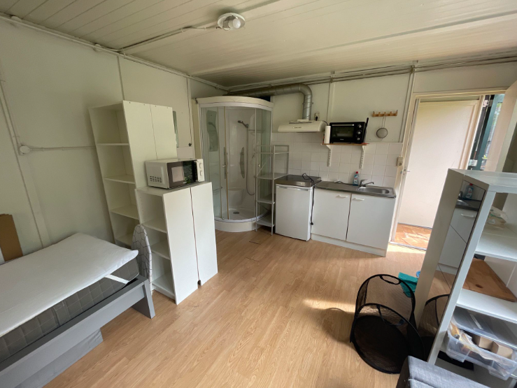 Kamer 14 bevindt zich aan de achterzijde van het pand en heeft een oppervlakte van 18,38 m². De ruimte is uitgerust met een eigen keuken, voorzien van alle noodzakelijke gemakken, evenals een eigen douchecabine, zodat deze niet gedeeld hoeft te worden. Daarnaast is er een gemeenschappelijk toilet aanwezig dat je deelt met één medebewoner. Tot slot is er een ruime achtertuin waar je je fiets veilig kunt stallen.