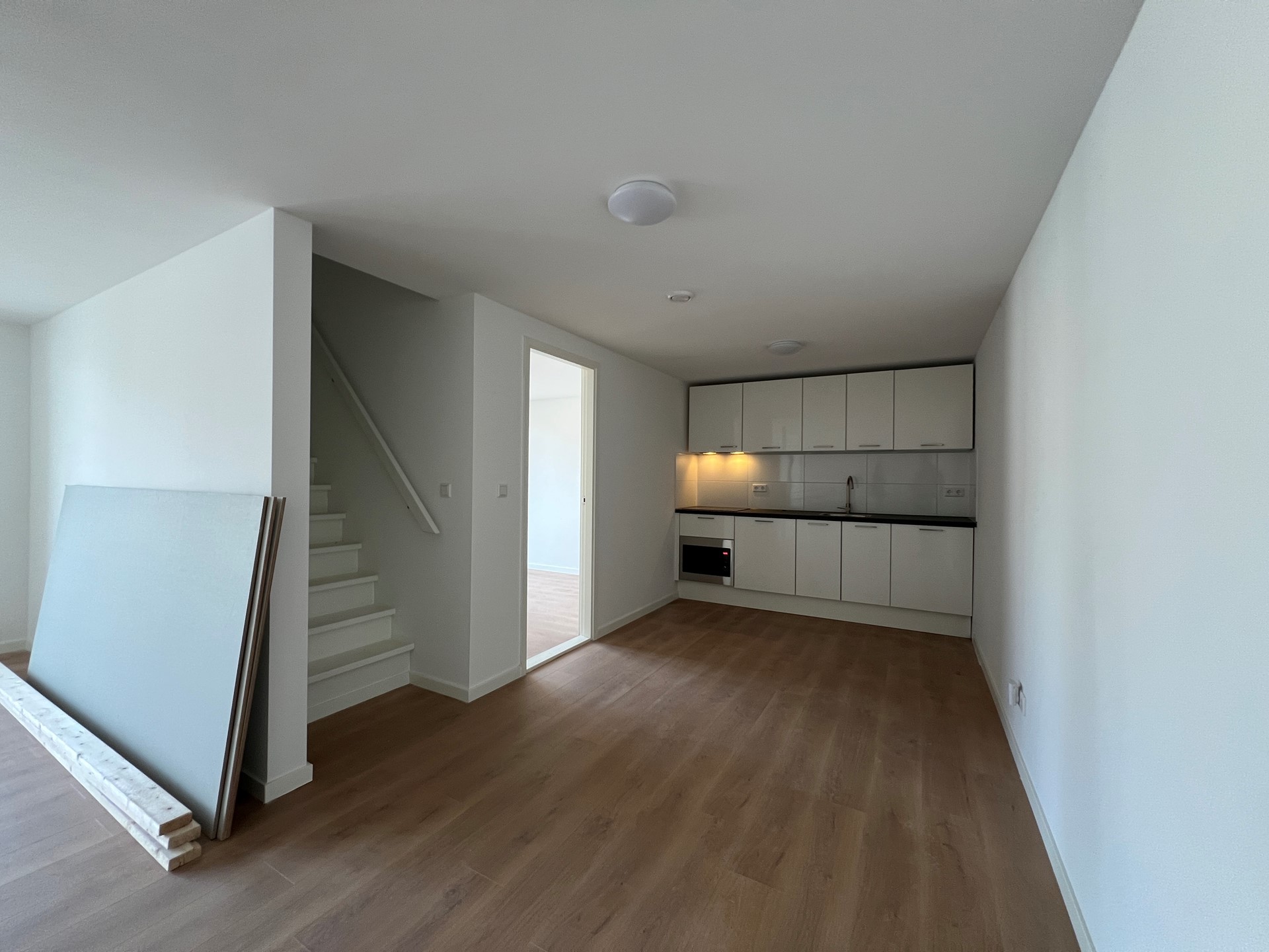 Je komt binnen in een gedeelde hal, die je deelt met twee andere adressen. Het appartement is verdeeld over de begane grond en de eerste verdieping en heeft een totale woonoppervlakte van circa 75 m². Bij binnenkomst stap je de woonkamer met open keuken binnen. De keuken is voorzien van een afzuigkap, inductiekookplaat, combi-oven, koelkast en vaatwasser. Op de begane grond bevinden zich daarnaast een slaapkamer en een apart toilet. Op de eerste verdieping vind je de badkamer en nog twee slaapkamers. De badkamer beschikt over een douche en wastafel. Tot slot beschikt het appartement over een gedeelde parkeerplaats, die wordt gedeeld met de twee andere adressen.